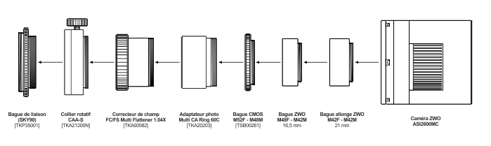 A titre d'exemple, le tirage de 55 mm nécessaire au montage d'une caméra ZWO derrière un adaptateur photo CA-35 au filetage M52 est respecté. Vous conservez ainsi la liberté de modifier votre train d'imagerie en suivant les préconisations de ZWO (remplacement de la bague de 21 mm d'épaisseur par une roue à filtres ou un tiroir, ou autre), sans avoir à vous soucier du montage Takahashi.