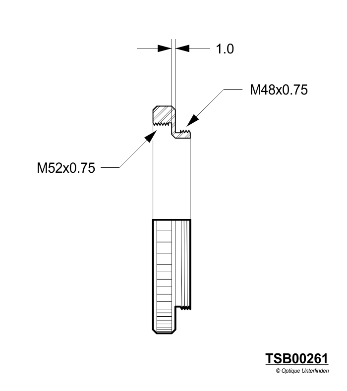 L'interface mécanique d'entrée est au filetage M52x0.75 femelle. L'interface mécanique de sortie est au filetage M48x0.75 mâle. Le tirage est de 1 mm.
