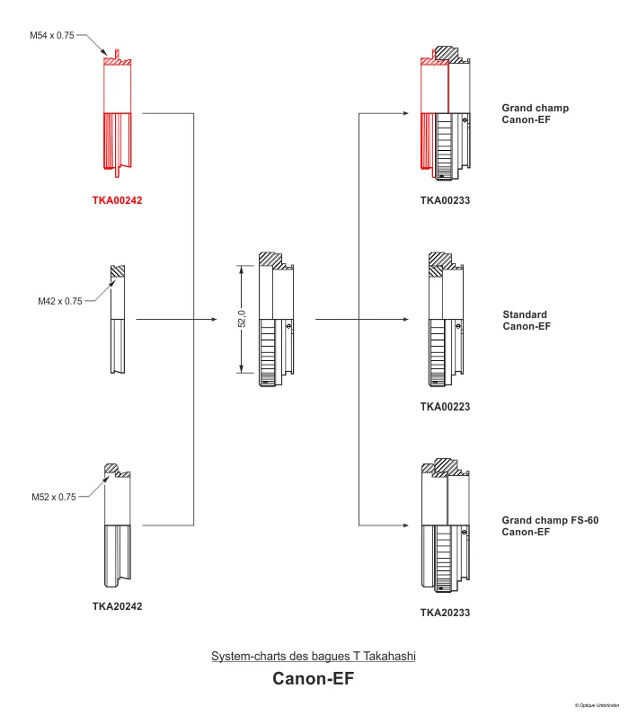 Attention ! Deux modèles sont disponibles car le diamètre du coeur des bagues T Takahashi est différent selon la marque du boîtier photographique : 52 mm de diamètre pour la bague T Canon EF (réf. TKA00242), 49 mm de diamètre pour celles des autres marques (réf. TKA00240).