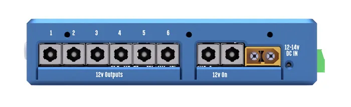 Six puissants MOSFETs intelligents fournissent le "jus" pour vos équipements. Des protections contre les courts-circuits et la surcharge coupent le courant en cas de problème et rapportent les incidents dans le logiciel de commande. Chaque MOSFET peut fournir un courant de 6A maximum. Les connecteurs de sortie sont métalliques et de haute qualité, assurant une fourniture de courant optimale et une sécurisation des branchements.