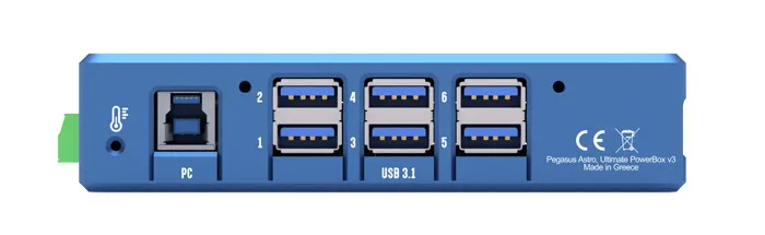 - Le boîtier Pegasus Astro UPBv3 est équipé de 6 ports USB3.1 et de 2 ports USB2