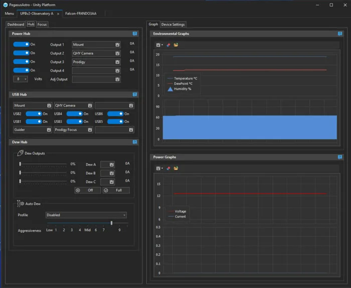 Pegasus Astro met gratuitement à disposition un logiciel de commande intégré appelé Unity. Ce logiciel, au design moderne et très soigné, offre la possibilité de piloter depuis un seul endroit tous les accessoires que propose la marque, que ce soit les boîtiers de commande comme l'UPBv3, les moteurs de mise au point ou les contrôleurs de résistances chauffantes. Le but est de proposer une application moderne et robuste capable de prendre en charge facilement tous les produits Pegasus Astro, existants ou à venir.