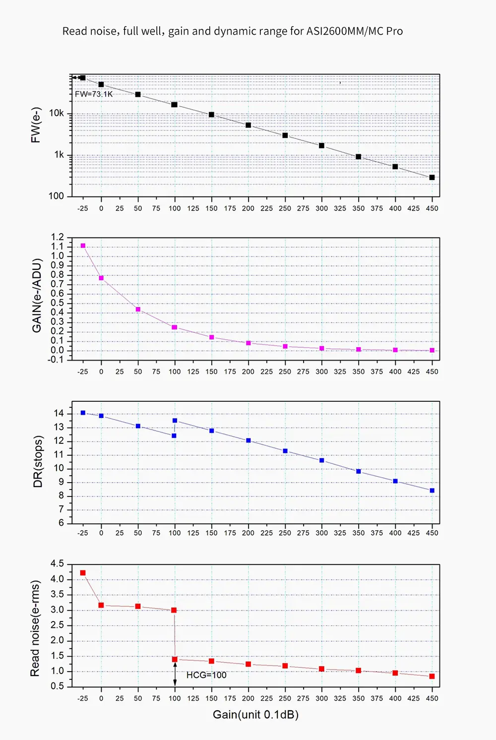 Le bruit de lecture est la somme de plusieurs composantes : le bruit thermique des photosites, les bruits liés à l'électronique du capteur et le bruit de quantification issu des étages de conversion analogique/numérique. Plus ce bruit de lecture est faible, meilleurs sont les résultats ; un travail technologique est donc réalisé à chaque niveau afin de le réduite au maximum. En sortie, la caméra intègre un dispositif HCG (High Conversion Gain) qui peut réduire le bruit de lecture à gain élevé tout en conservant la grande dynamique que vous obtiendriez à faible gain. Ce mode HCG s'active automatiquement dès que le gain atteint 100.