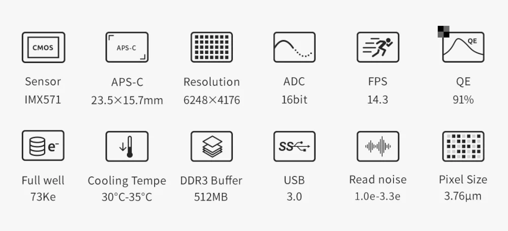 - Capteur d'imagerie CMOS monochrome Sony IMX571 (26 Mégapixels) au format APS-C (3.76µm)