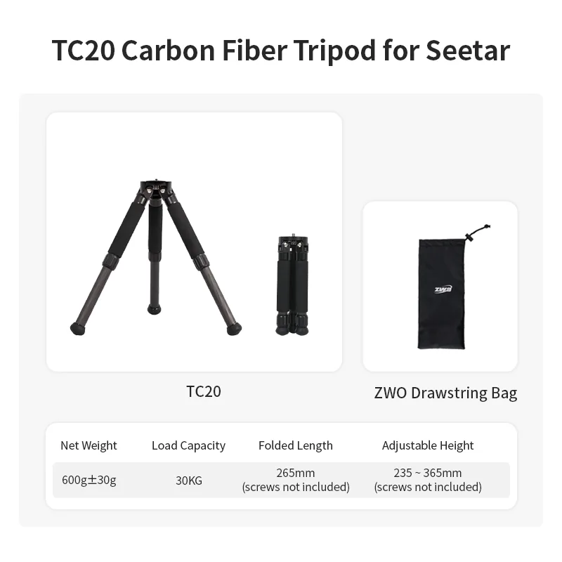 Le trépied ZWO TC20 est un modèle léger et robuste, muni de jambes en fibres de carbone, parfait pour les astronomes amateurs itinérants et en particulier les possesseurs des télescopes ZWO Seestar (il est inclus de base avec le S50). Ne pesant que 600g, il peut supporter une charge maximale de 30kg. Son encombrement est faible ; il ne mesure que 26.5cm de longueur, une fois replié. Sa platine supérieure possède une vis au filetage du Congrès (3/8").