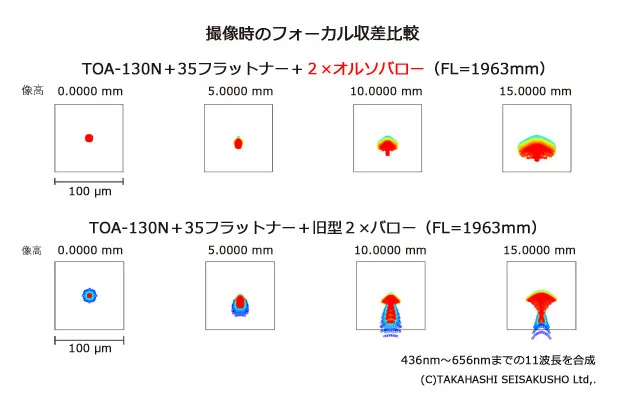 Avec sa lentille de Barlow Ortho 2x, Takahashi propose un multiplicateur de focale qui vise à conserver au maximum les propriétés de l'objectif auquel il est associé. Pour concevoir ses oculaires et sa lentille de Barlow, Takahashi travaille sur l'intégralité de la chaîne optique, partant d'un objectif sans aberration (généralement, la référence est le triplet apochromatique de la lunette TOA) pour aboutir à l'oeil ou au capteur ; le but étant de n'ajouter aucune aberration supplémentaire, voire de corriger certains défauts de l'objectif. De fait, l'association de la lentille de Barlow avec les oculaires de la série TPL produit une image de meilleure qualité, que ce soit au centre du champ ou en périphérie, que lorsque la Barlow n'est pas utilisée. Au centre, la lentille annule même la très faible aberration chromatique résiduelle de l'objectif de la TOA. Les performances photographiques de la lentille de Barlow Ortho 2x sont nettement supérieures à celles de l'ancien modèle, que ce soit en terme de chromatisme et de coma en bord de champ.