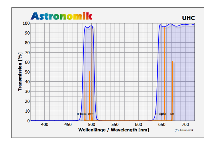 Le filtre UHC (Ultra-High Contrast) est un filtre destiné à l'observation visuelle du ciel profond. Il transmet 100% de la lumière des raies spectrales O-III et H-beta, 96% de la raie H-alpha (même si son utilisation est réservée à l'imagerie) et intercepte toutes les autres longueurs d'onde. Ainsi, l'image se trouve nettoyée des lumières parasites provoquées par la pollution lumineuse. Cela permet de rehausser le contraste des nébuleuses diffuses et planétaires, qui se détachent sur un fond de ciel devenu bien noir.