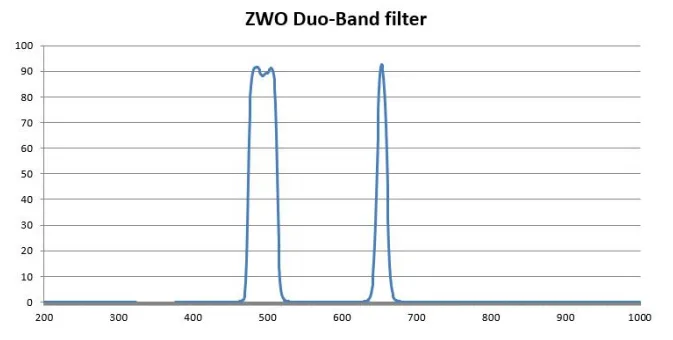 Afin de limiter la pollution lumineuse, véritable fléau en visuel et davantage pour l'astrophotographie, ZWO propose un filtre "2 en 1" : le Duo-Band ! L'idée est simple et consiste à rassembler 2 filtrations : une autour de la raie H-Alpha et l'autre autour des raies O-III. Grâce aux dépôts de multiples couches de traitements haute réflectivité, la transmission dans ces 2 pics d'émissions caractéristiques des nébuleuses atteint un minimum de 90%.