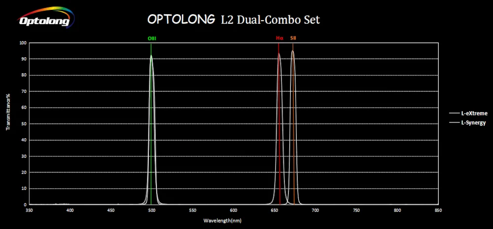 Pour photographier les plus belles nébuleuses en HSO (palette de couleurs "Hubble"), Optolong propose plusieurs filtres Duo-Band. Afin d'avoir les 3 raies spectrales H-Alpha, O-III et S-II il faut combiner 2 filtres. C'est le principe de ce pack "L2-Combo" qui comprend le L-eXtreme et le L-Synergy.