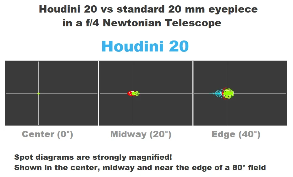 Robert Houdart, créateur de la marque Houdini Telescopes, observateur belge depuis de nombreuses années d'un télescope de 1.1m à f/3.6 a décidé de créer sa propre gamme d'oculaires afin de répondre à ses attentes. Son télescope, et la plupart des Newton/Dobson sont en effet sensibles à une aberration optique, la coma, qui dégrade fortement la forme des étoiles en bord de champ (en forme de comète). Et ceux d'autant plus que le rapport de focale de l'instrument est faible. A f/5 cette aberration n'est pas encore trop visible mais en dessous elle réduit nettement la beauté des objets célestes dont l'observateur souhaite profiter. De plus elle n'est pas linéaire… à f/4 elle est 2x fois plus présente qu'à f/5 !