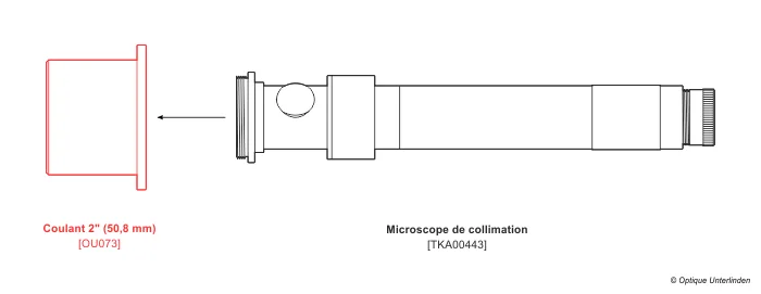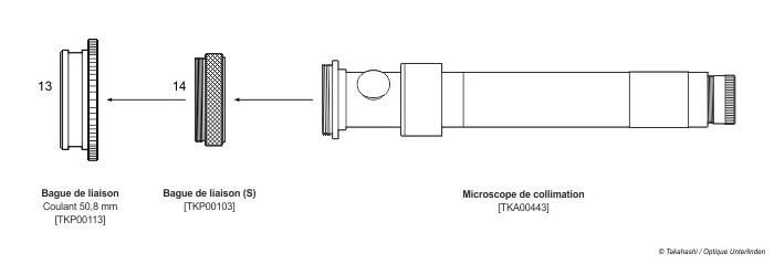 Pour les télescopes Takahashi Mewlon-250CRS et Mewlon-300CRS, le microscope de collimation se visse directement sur le filetage M36.4 de la bague n°14 du porte-oculaire.