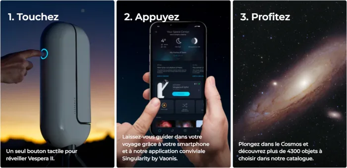 Vespera II est un télescope d’une nouvelle génération, c’est un hybride parfait entre un télescope connecté et un appareil photo. Avec une expérience d’observation complètement repensée, remplaçant l’oculaire par une application mobile, il devient alors facile pour tout le monde d’accéder aux merveilles de l’Univers. Compact, intuitif, intelligent et connecté, il permet par ses différentes fonctionnalités de découvrir et partager en famille ou entre amis les merveilles du ciel nocturne.