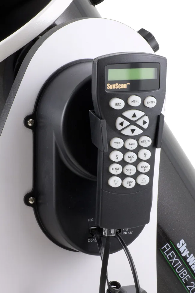 Pour offrir plus de confort à l'utilisateur, Sky-Watcher a décidé d'équiper sa gamme de Dobson d'une motorisation double axe (équivalent d'une monture altazimutale motorisée) avec une raquette de commande capable d'effectuer des pointages et le suivi. Ainsi nul besoin de connaître la position des étoiles ou des astres lointains du ciel profond, la monture Dobson AZ GOTO se charge se déplacer l'instrument vers la cible que vous désirez observer.