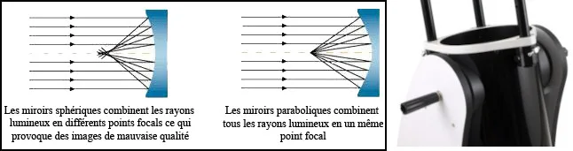 Au contraire des fabrications très bon marché ou les télescopes Newton de petits diamètres, les Newton (Dobson) Sky-Watcher de 203 à 400mm disposent d'un miroir primaire parabolique. Les miroirs sont polis sphériquement puis retaillés pour atteindre une forme paraboloïdale (plus coûteuse et difficile à obtenir). C'est un critère de choix indispensable pour les instruments au-dessus de 130mm et à f/D court.