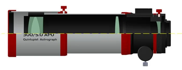 | Objectif | Quintuplet Petzval APO (air-spaced) - un élément ED inclus |