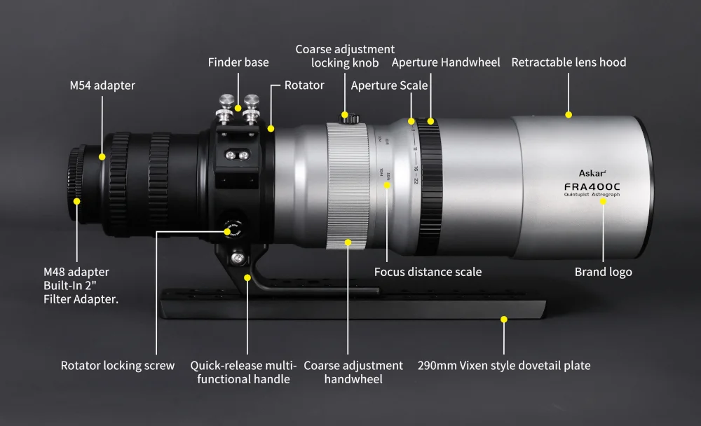Afin de répondre à ses clients qui cherchaient plus de polyvalence pour la FRA400, Sharpstar a décidé de transformer en téléobjectif sa célèbre lunette. La FRA400C reprend donc la qualité optique de la FR400, dont un objectif quintuplet ED, capable d'être utilisé aussi en visuel et observation diurne (ornithologie, bâtiments, paysages). Depuis leur création, les astrographes Askar de la gamme FRA (à rapport de focale court) ont été très bien accueillis par les astrophotographes du monde entier. Le modèle FRA400 est un astrographe compact de type Petzval avec un diamètre 72mm et une ouverture à f/5.6. Les étoiles sont nettes et fines, au centre du champ de vision comme sur les bords même avec un grand capteur.