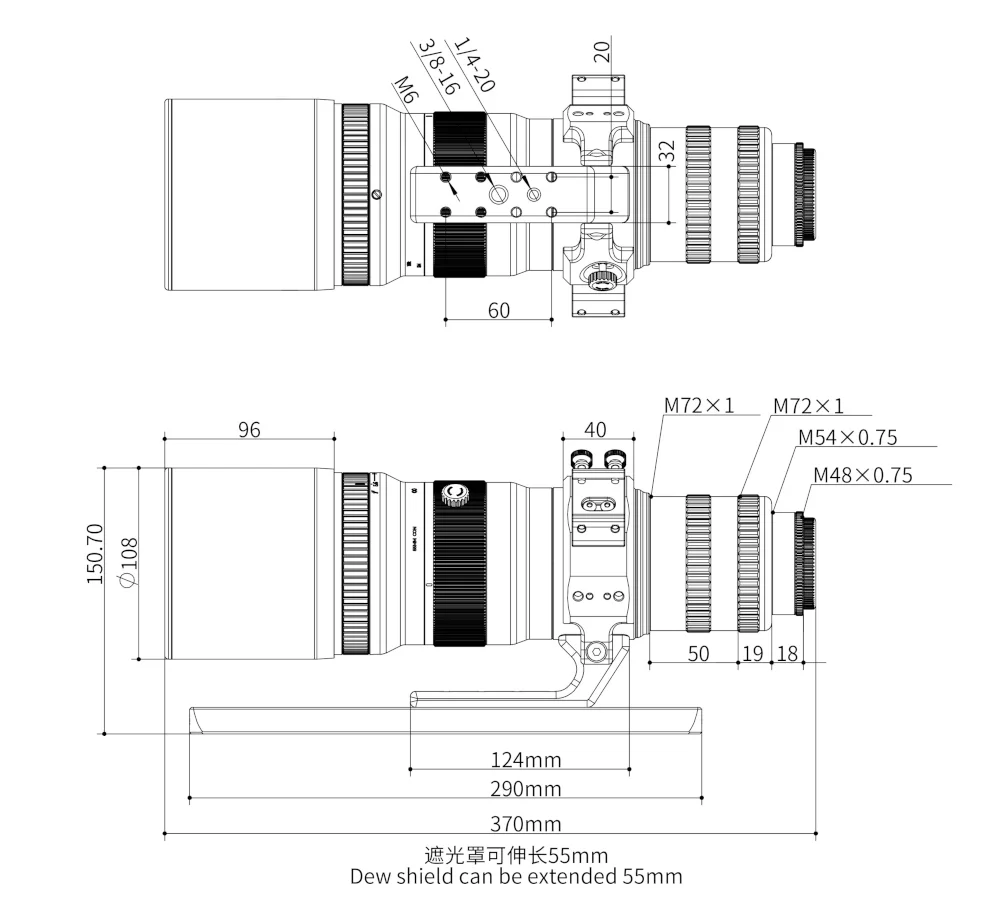 Pièce majeure de tout téléobjectif, la mise au point centrale est hélicoïdale avec une vis de blocage. Vers l'avant une bague permet de régler l'ouverture du diaphgramme de f/5.6 à f/22 grâce à 17 lames. La sortie de l'instrument est équipée de plusieurs adaptateurs de filetage M72/M54 ou M48. Un adaptateur 2" ou 31.75mm permet d'ajouter vos accessoires ^pour vos observations visuelles (renvoi coudé, oculaires). Une vis moletée permet de régler la rotation de l'instrument sur 360° pour ajuster votre cadrage, ce qui permet à l'utilisateurs de faire pivoter l'angle de prise de vue à tout moment.
