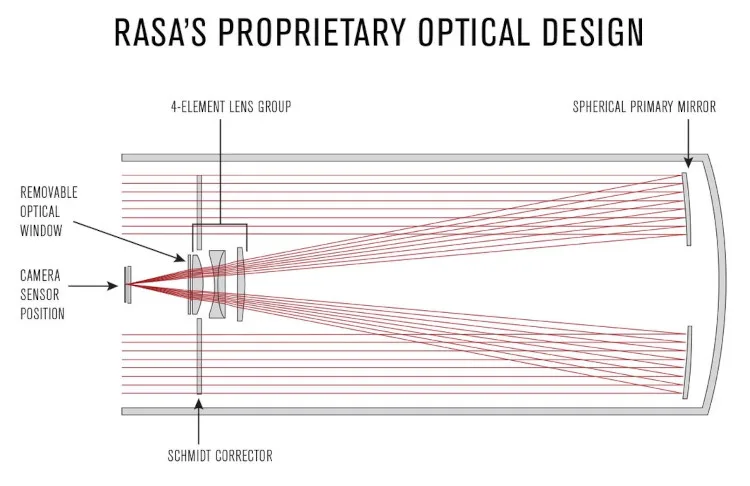 L'optique produit une image à l'avant du télescope, pas à l'arrière. Par conséquent, vous ne pouvez pas regarder à travers le RASA 11" avec vos yeux car votre tête empêchera la lumière d'entrer dans le télescope. De plus on ne peut y rajouter un oculaire. Le RASA 11" est un astrographe spécialement conçu pour l'imagerie astronomique du ciel profond.