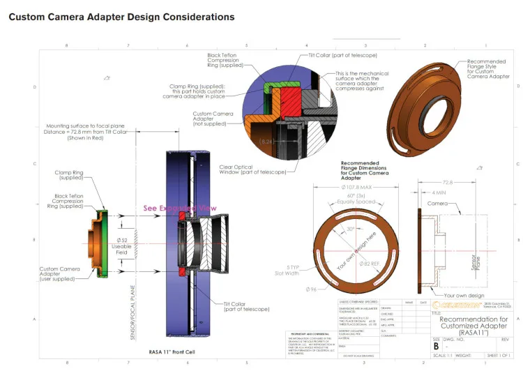 Le RASA 11" a un champ utilisable de 43.3mm. Un capteur avec une diagonale plus grande que cela, comme un appareil photo sans miroir plein format, peut être utilisé, mais il y aura une baisse des performances optiques et du vignettage dans les coins de l'image. Cela peut nécessiter un recadrage pendant le traitement de l'image.