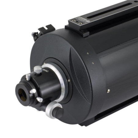 Le tube optique est métallique et s'adapte sur votre monture à l'aide d'une queue d'aronde "large" type Losmandy ou d'une classique type Vixen. Pour éviter le shifting (inclinaison du miroir primaire lorsqu'il est déplacé par une molette de mise au point) le miroir primaire est fixe... la mise au point s'effectue à l'aide d'un porte-oculaire Kepler Crayford 2" placé à l'arrière de l'instrument. Grâce à une démultiplication 10:1, la netteté s'obtient très facilement et précisément en visuel à faibles et forts grossissements. Plusieurs allonges de différentes longueurs au format M90 permettent d'adapter une grande variété d'accessoires (renvoi-coudé 50.8mm, tête binoculaire, roue à filtres, diviseur optique, caméra CCD/CMOS...). Niveau chercheur la plupart sont compatibles grâce au sabot de fixation Kepler/GSO présent sur l'instrument.